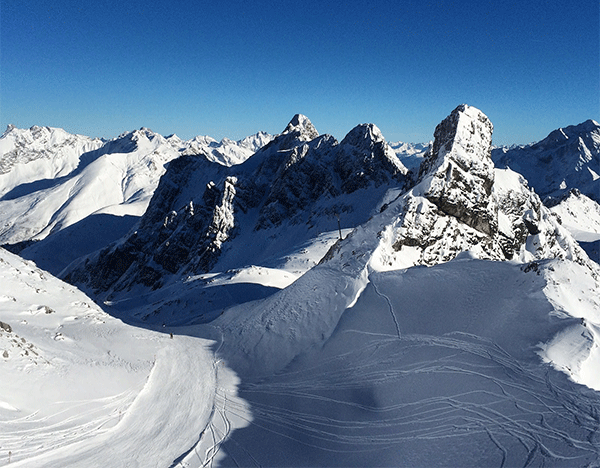En glittrande bluebird day i St. Anton. Var ska man börja? Svaret är enkelt: Valluga! Valluga-toppen är 2811 meter hög och är ett måste att besöka för alla skidåkare. Inte minst för de härliga breda pisterna som löper ner från berget; utsikten är slående! En solig dag kan man nämligen se fem olika länder: Österrike, Liechtenstein, Italien, Schweiz och Tyskland.