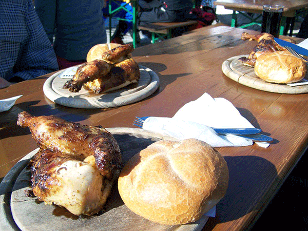 Den spröda kycklingen serveras med krispiga, gyllene pommes och kanske till och med en väl-kyld Zillertal öl.