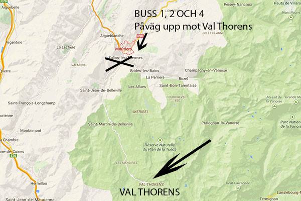 Buss 1, 2,4 sitter nu i kö vid foten av berget för att ta sig upp mot Val Thorens.
